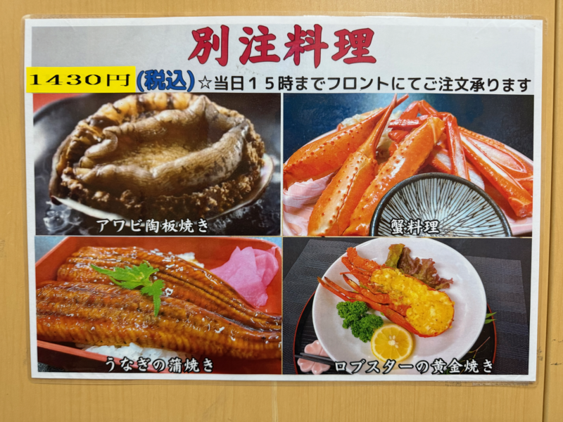 ホテルの夕食は, バイキング方式でした. 18時45分から20時までと時間制限がありましたが, 1泊2食付き1人8,000円としては, かなりお得でたくさんの料理が並んでいました. 1,430円を追加するとさらにアワビのステーキ, 伊勢エビの黄金焼き, 鰻の蒲焼き, 茹でガニが食べられるとのことでしたが, 追加しなくても豊富な料理だったので満足しました.