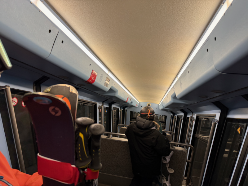 スンネッガに到着して, スキーを履きました. 今日は, 曇り時々雪の天気予報だったので, 雪が降り出したらすぐに街にもどれるように, スンネッガの周りで滑ることにしました.