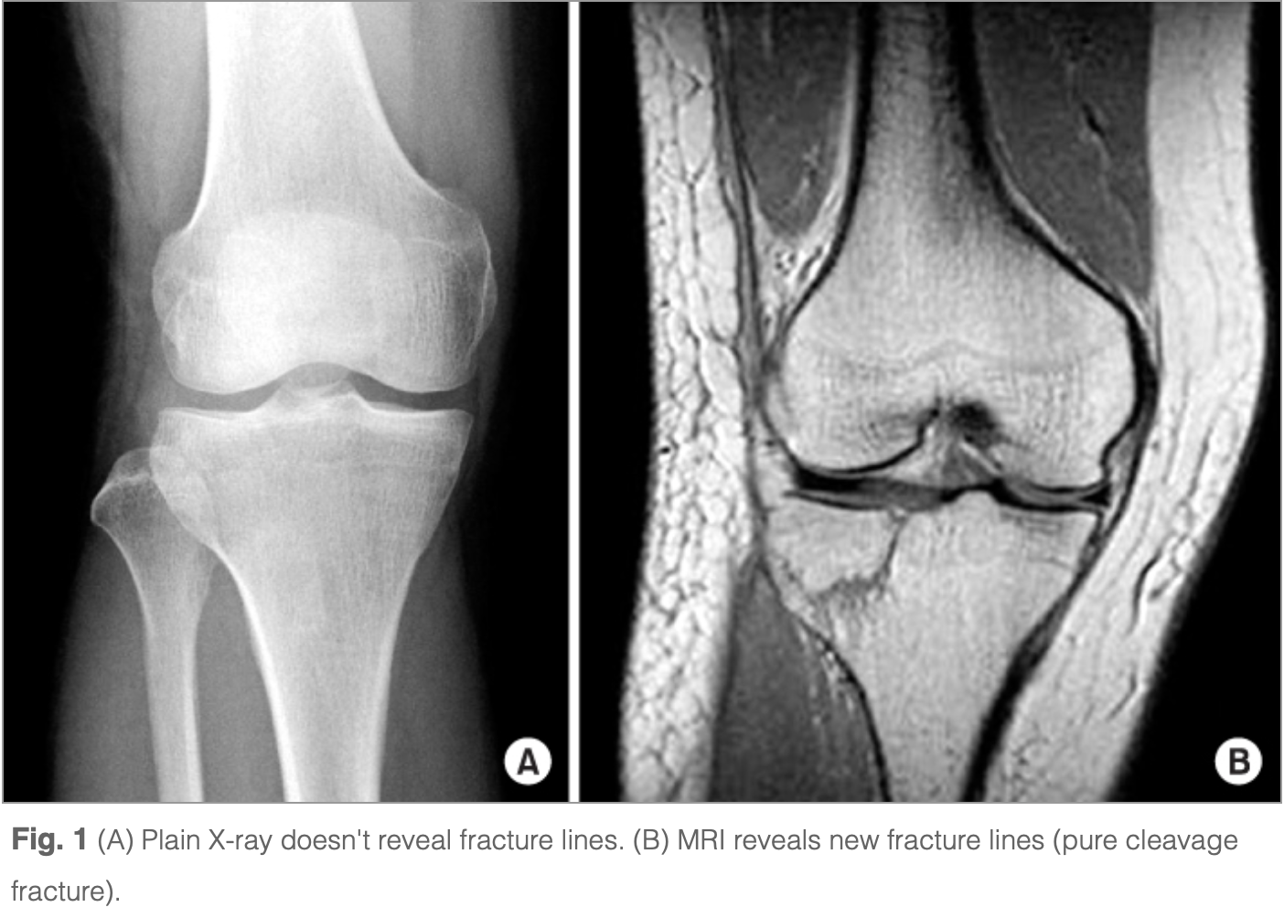X線写真(左上A)では, 骨折は不明瞭ですが, MRI(右上B)では, 骨の中に黒い線があって, 骨折があることが判ります.