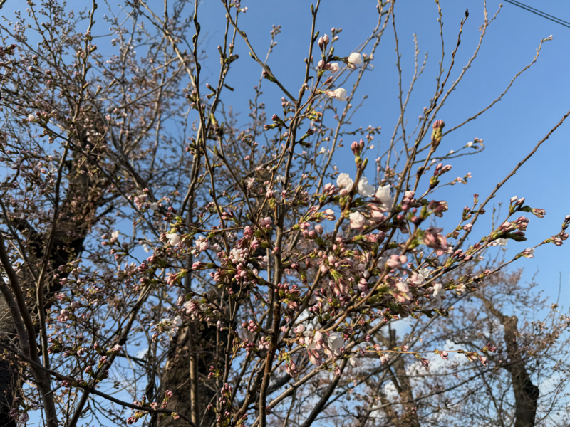 家に帰ると, 家の前の桜並木の桜が少しだけでしたが, 咲いているのを見ることができました. 車を停めた後に, スキーウエアのまま歩道に出て, 写真を撮りました.