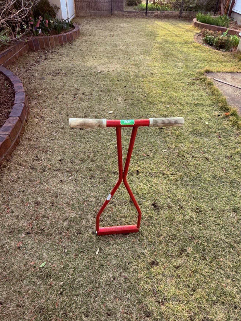 16時過ぎから庭の芝生のエアレーションを行いました. 芝生の根を活性化させるために, ローンスパイクという器具を芝面に刺し込んで, 根切りと空気孔を開ける作業です. 昨年は, 骨折した後, 右脚に体重をかけていなかったので, この作業ができませんでした.