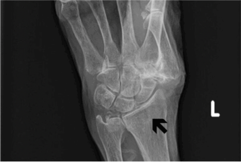 診察したところ, 手首の変形はありませんでしたが, 腫れていて, 腕の骨(橈骨とうこつ)の手首に近い部分を圧すと痛がるので, 橈骨遠位端骨折と診断して, X線写真を撮るようにオーダーを入れました.