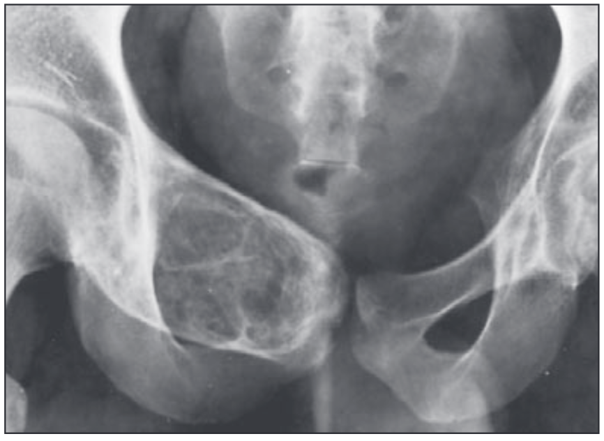 恥骨を破壊した腫瘍が骨の外に出て, 前下方の筋肉の中に進展しています.