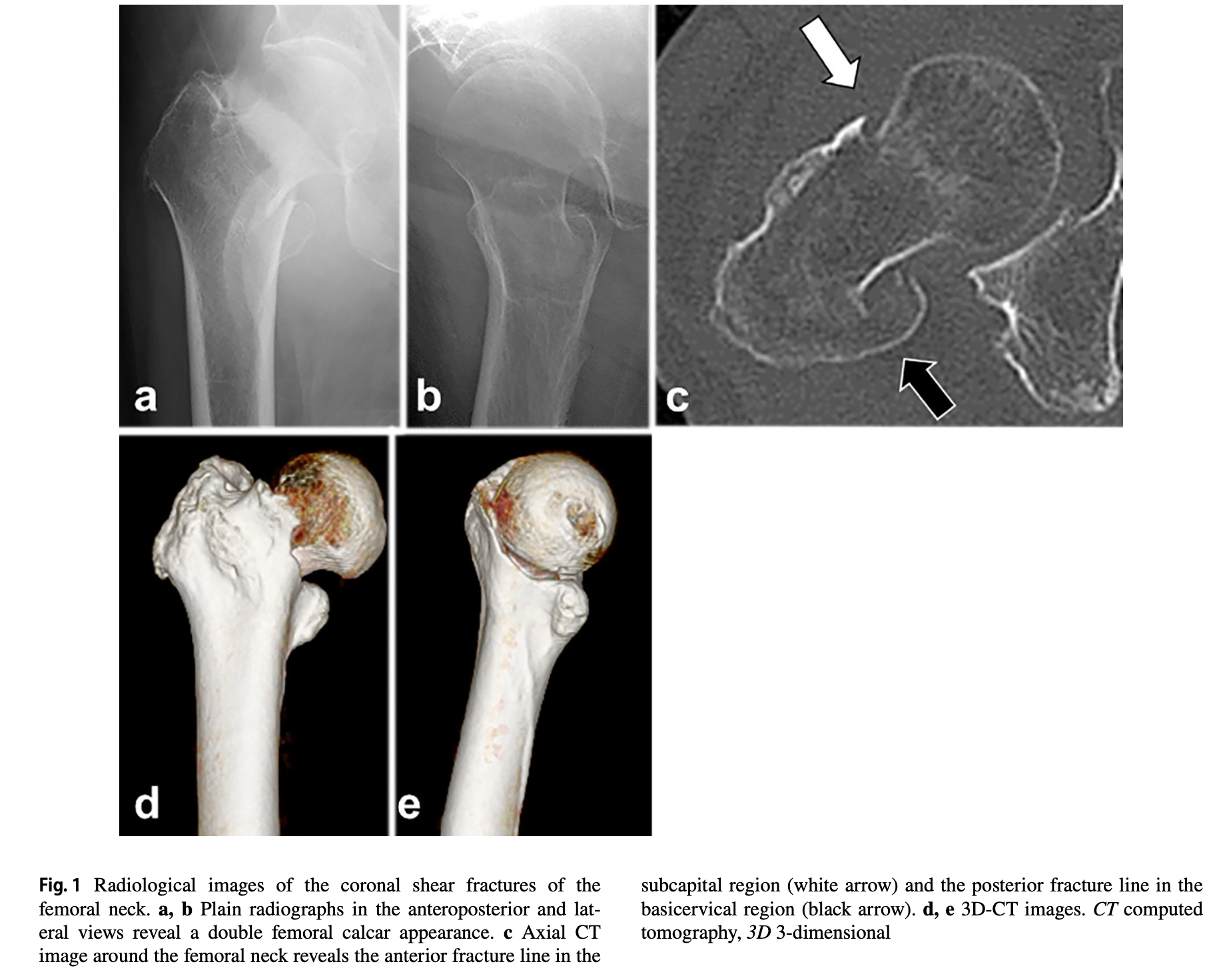 前方では, 大腿骨頚部を骨折線が通っていて, 後方では頚基部を通っています.