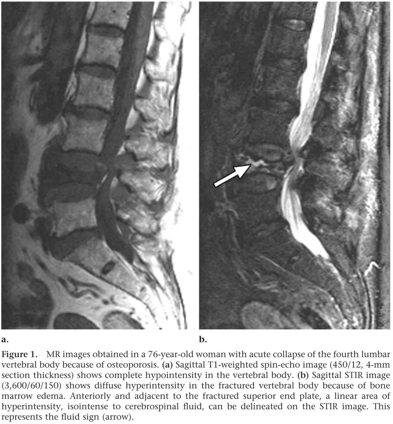 一方, STIR像(b)では, 椎体の中に真っ白く写る部分があります.