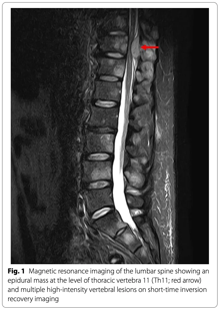 骨折はなく, 脊椎内に多数の円形陰影を認め, 大腸癌の既往から多発骨転移と診断.