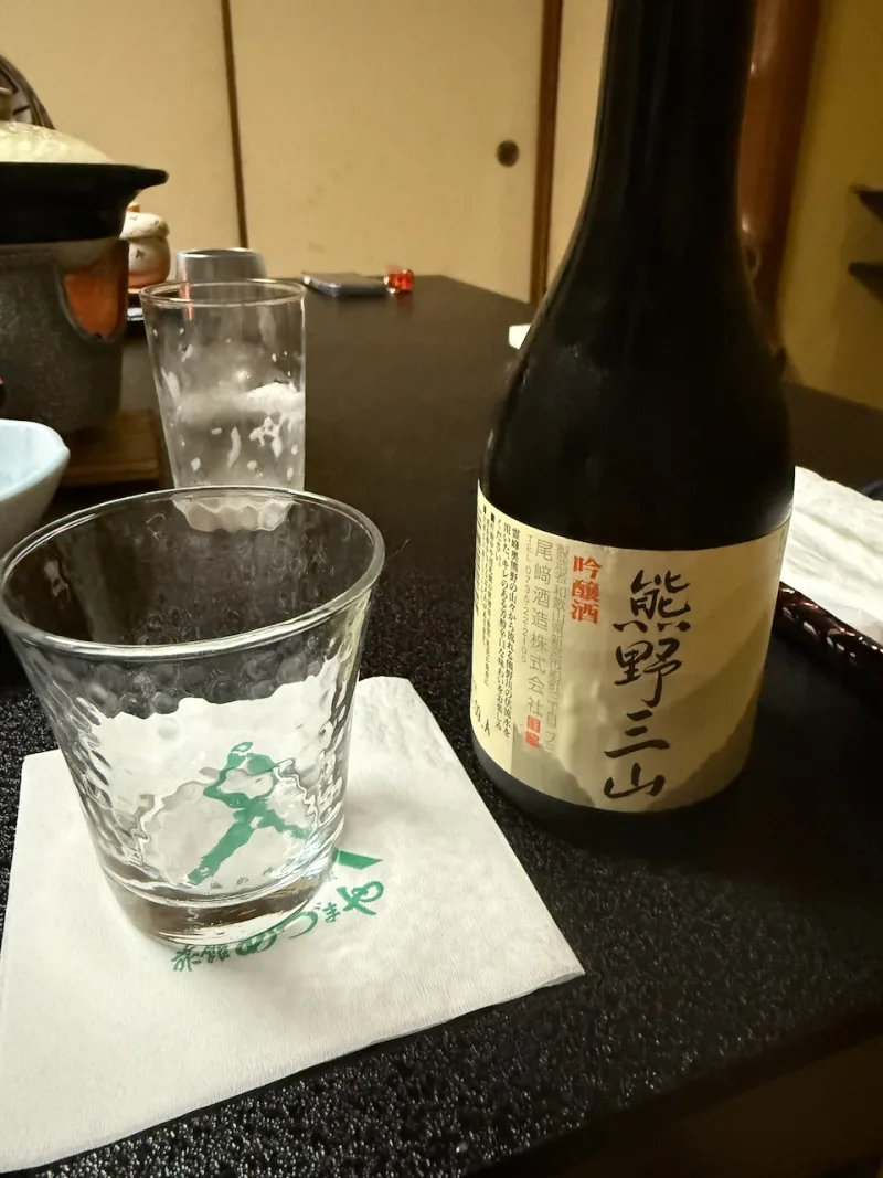 熊野三山詣の締めくくりに, 地元熊野川の伏流水で醸されたお酒『熊野三山』の吟醸冷酒をいただきました.