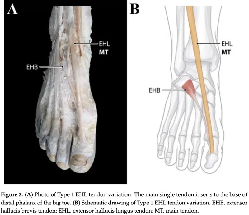 あしの親指(第一足趾)を伸ばす腱(長母趾伸筋腱 Extensor hallucis longus tendon (EHL, 上図参照), 短母趾伸筋腱 Extensor hallucis brevis tendon(EHB))が切れた状態でした.