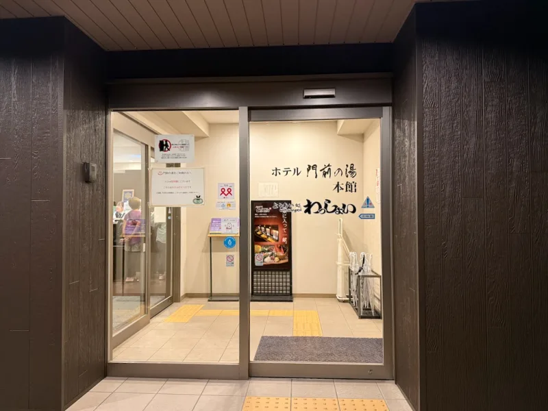 宿泊先は『ホテル門前の湯』. ホテルと日帰り温泉, 居酒屋が一体となった施設です.