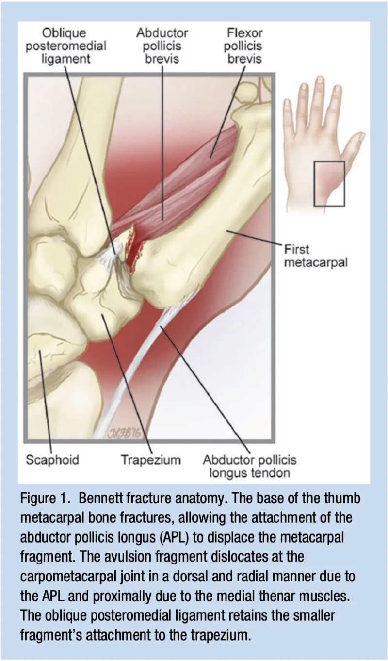 第1中手骨(Fisrst metacarpal)の基部を骨折すると, 第1中手骨は長母指外転筋腱(Abductor pollicis longus tendon)に引っ張られて, 外側にずれてしまい. 第1中手骨と大菱形骨の間の関節で第1中手骨が脱臼します.
