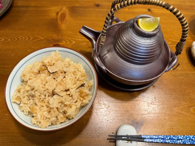 羅臼昆布と鰹節でとった一番出汁に, 鶏肉・海老・銀杏・松茸を加えて一煮立ち.