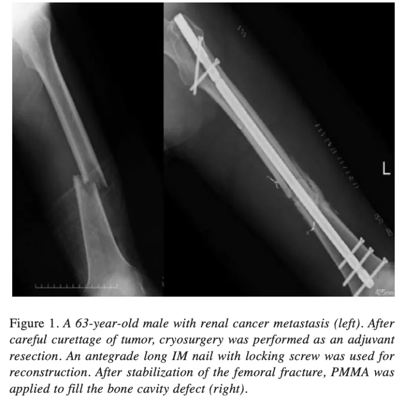 大腿骨骨幹部骨折の患者さんは, 2か月前から大腿部痛が続いており, 昨晩, 立ち上がった際に突然激痛で動けなくなったとのこと.
