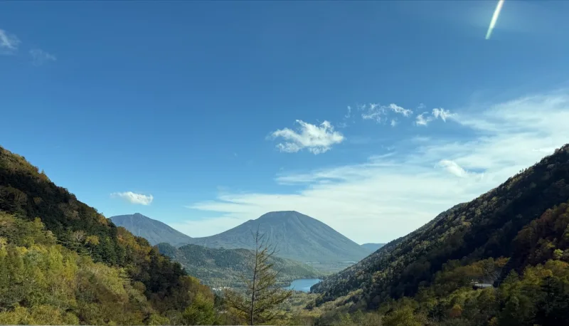 金精峠を下る途中, 展望の開けた場所で車中から『男体山』と『中禅寺湖』を撮影.