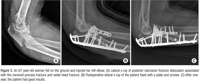 尺骨は肘頭プレートという金属製の板をあてがって整復固定しています.