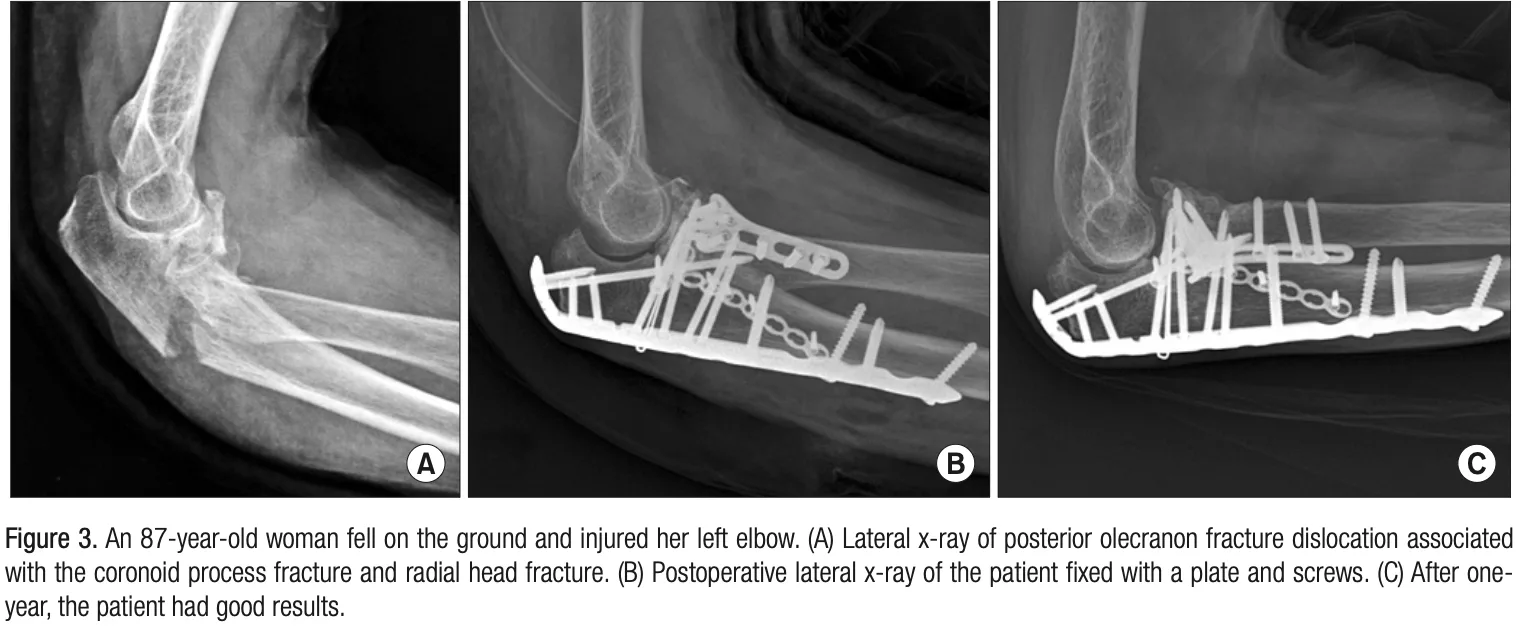 尺骨は肘頭プレートという金属製の板をあてがって整復固定しています.