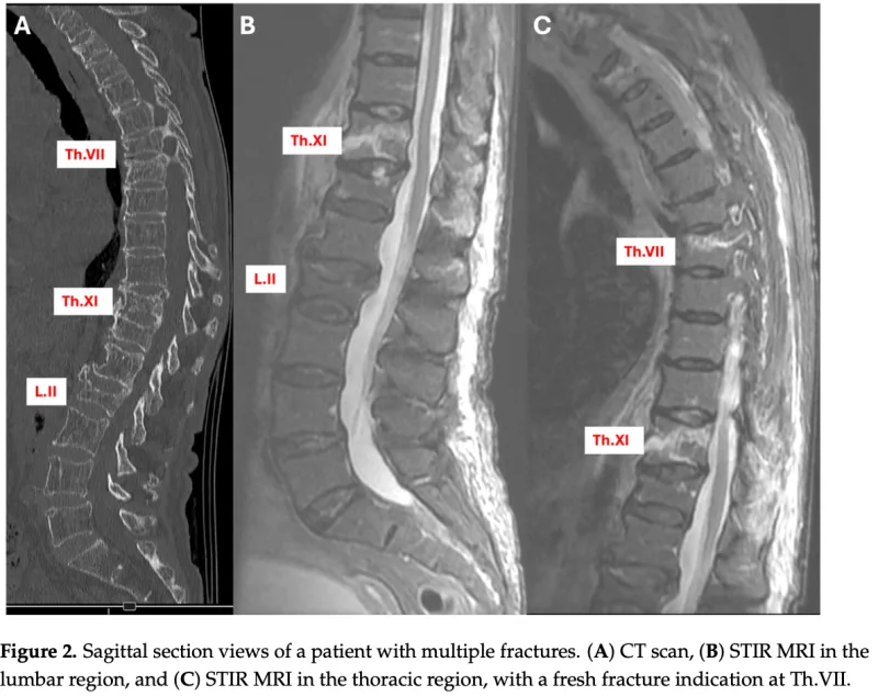 MRIの結果, 新しい骨折は第7胸椎だけで, 第11胸椎と第2腰椎は以前の骨折であることが判りました.