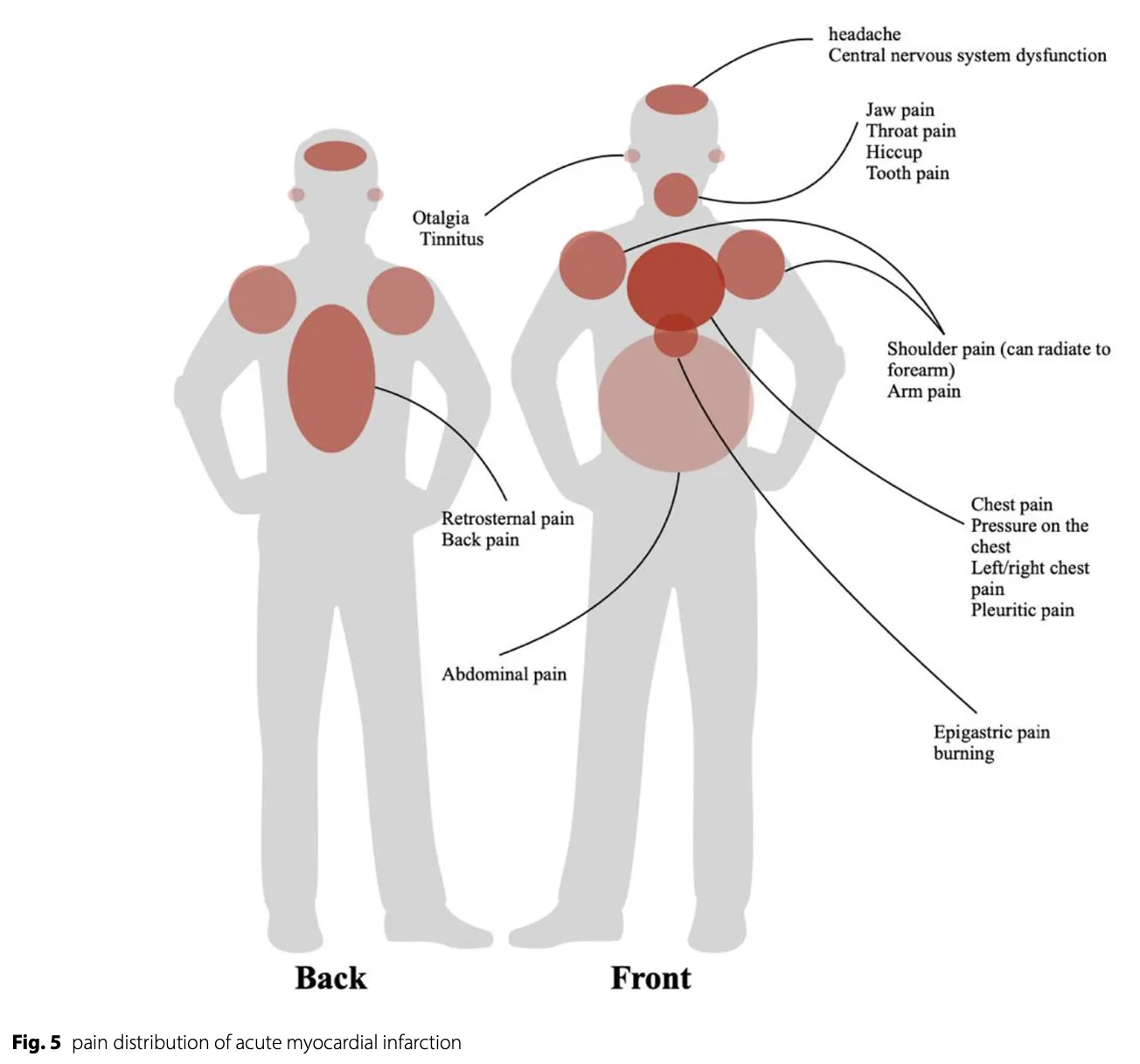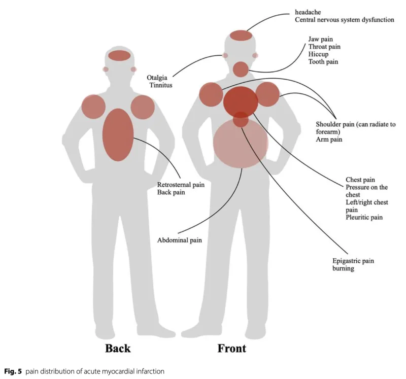 胸の前方の他に, 頭や首, 肩や背中, お腹の痛みを訴える場合もあります.