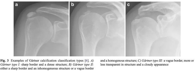 肩腱板の石灰性腱炎のX線写真とGärtner分類.