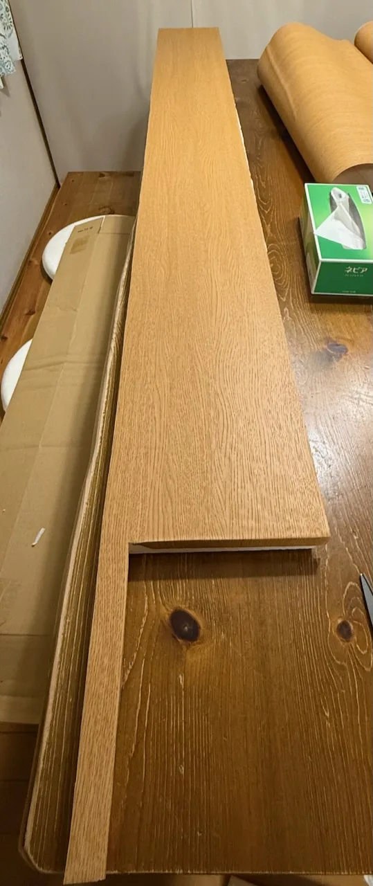 続いて, 丸まり癖をとっておいたホワイトオーク柄の壁紙をカットしてスチロール板へ貼り付け.