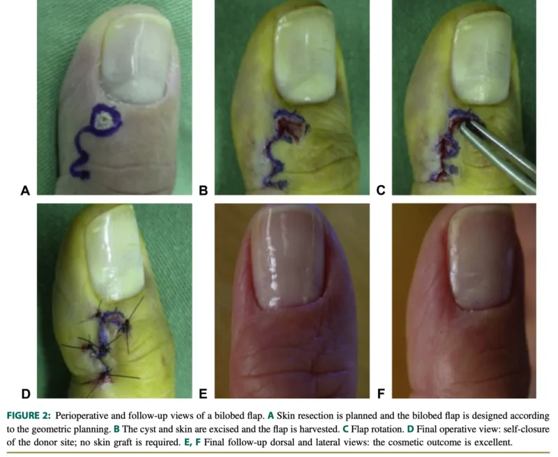 切除後に生じた皮膚欠損は, 局所回転皮弁(bilobed flap)で修復しました.