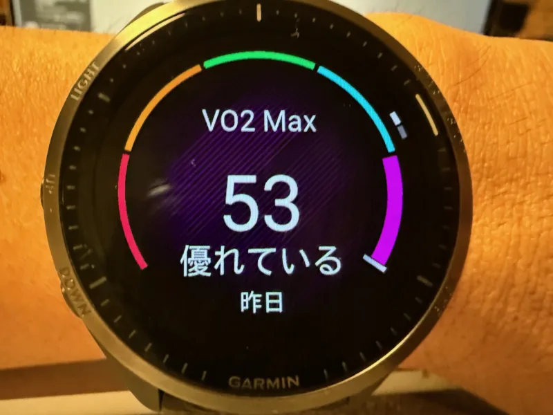 ガーミンのスマートウォッチを見ると, VO2 Maxは53に上昇.