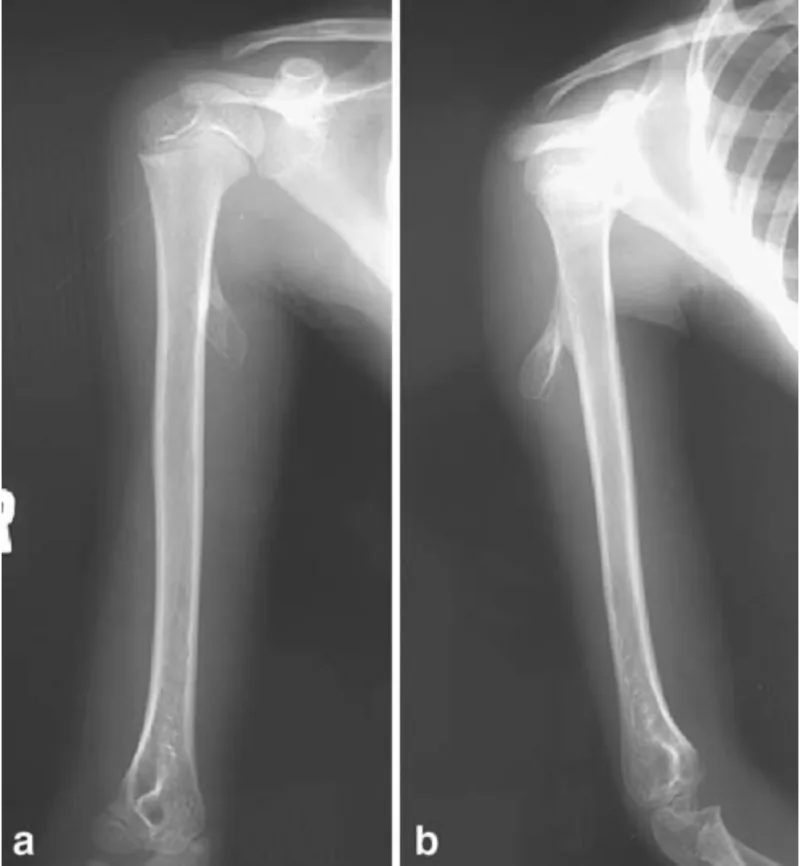 上腕骨からキノコ状に隆起しているのが腫瘍です.