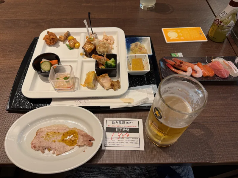 その場で握ってくれるノドグロをはじめとした高級魚の寿司, 新鮮なお刺身, カニの食べ放題, 仙台牛ステーキ, TOKYO Xのローストポーク, フカヒレの煮こごりなどなど.