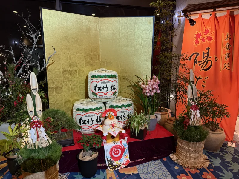 食事処の前には, 門松と鏡餅が飾り付けられて, 正月らしい景色です.
