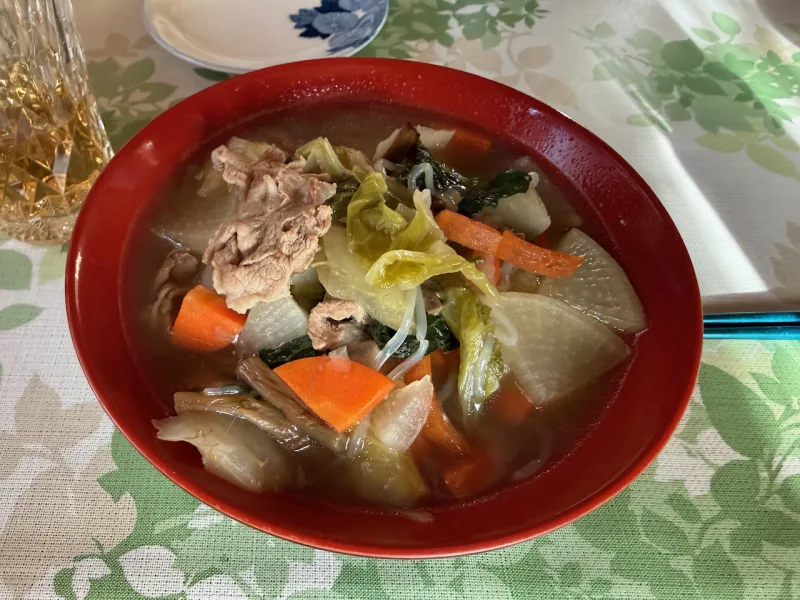 豚肉, 干したゼンマイ, 人参, 大根, 白菜, 糸こんにゃくと具沢山で, 毎年変わらない味です.