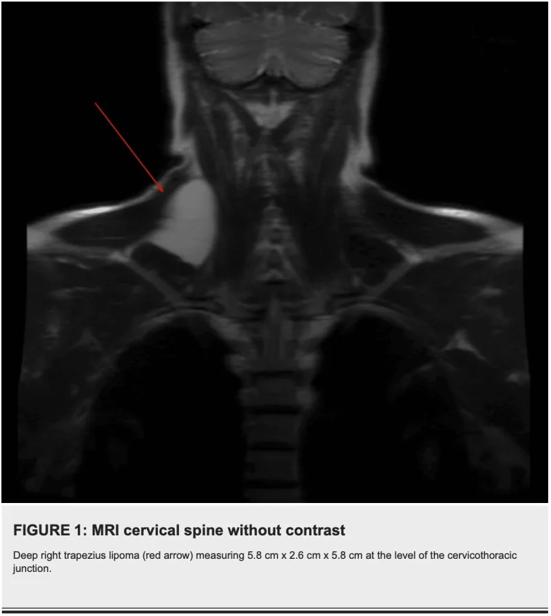 13時半から, 頚部後側方に生じた筋肉内脂肪腫の摘出術.