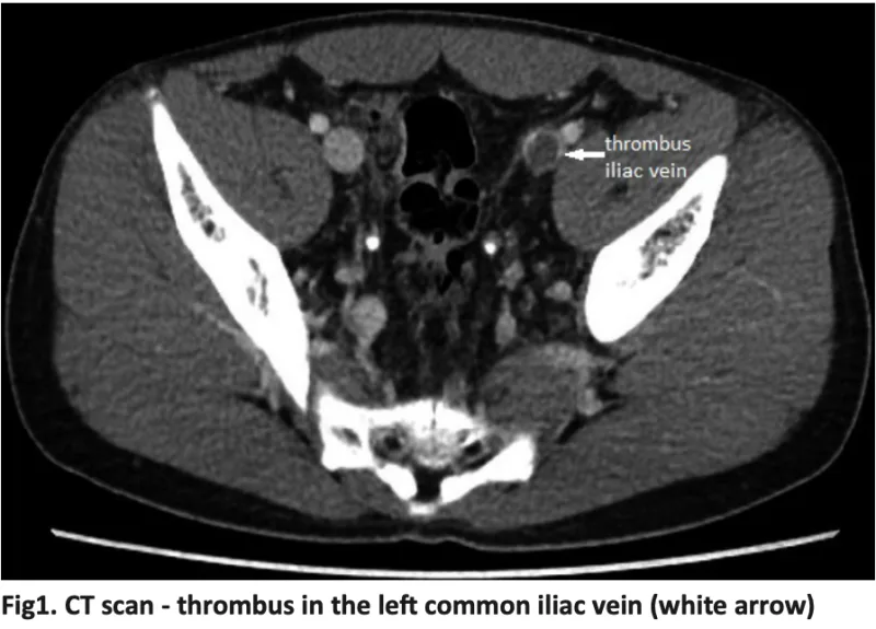 造影CTでは骨折側の総腸骨静脈から後脛骨静脈にかけて, 広範囲に血栓が存在.