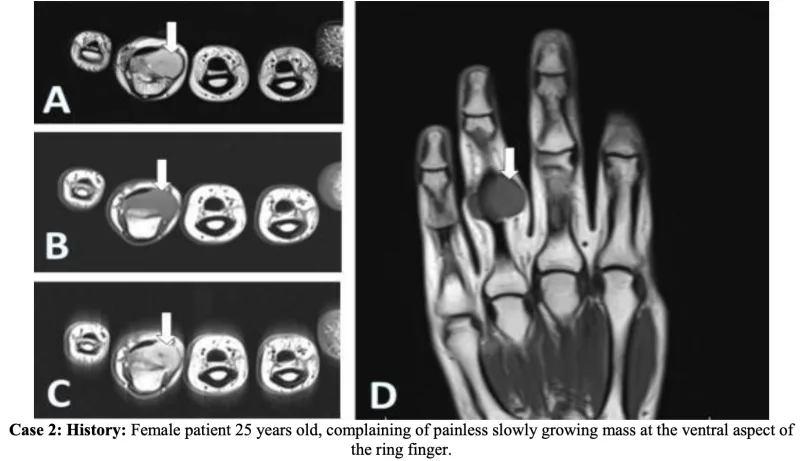 環指の屈筋腱周囲に発生した腱滑膜巨細胞腫の事例のMRI.