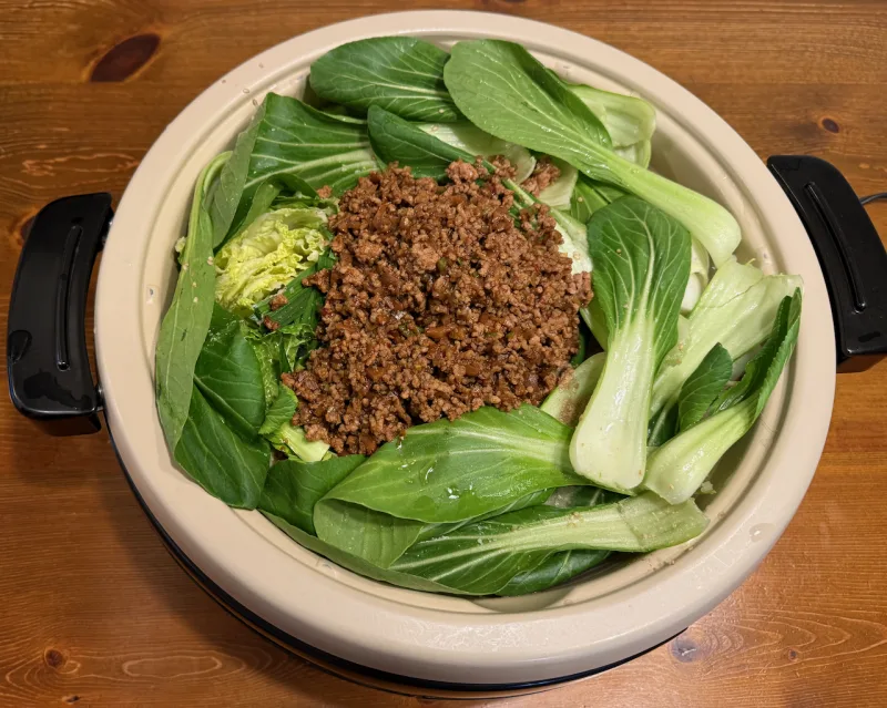 中華鍋で中華肉味噌を作り, 鶏ガラスープとすりごまで煮た野菜の上に肉味噌をオン.