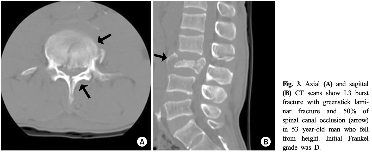 本日撮影したX線写真では, 椎体の高さが29 mmから24 mmと5 mmも短縮しており, また, 椎体後壁にも骨折が及んでいて, 破裂骨折と診断し, CTをオーダーしました.