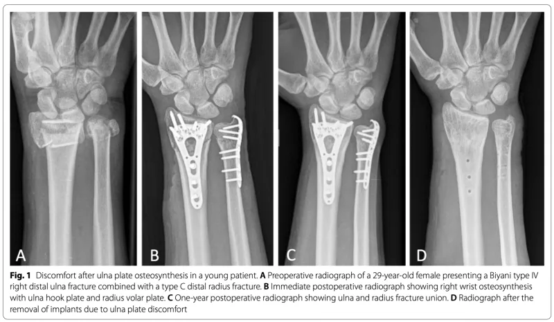 13時半から1年前に橈骨遠位端粉砕骨折, 尺骨茎状突起の手術を行った中高年患者さんに対する骨内異物除去術.