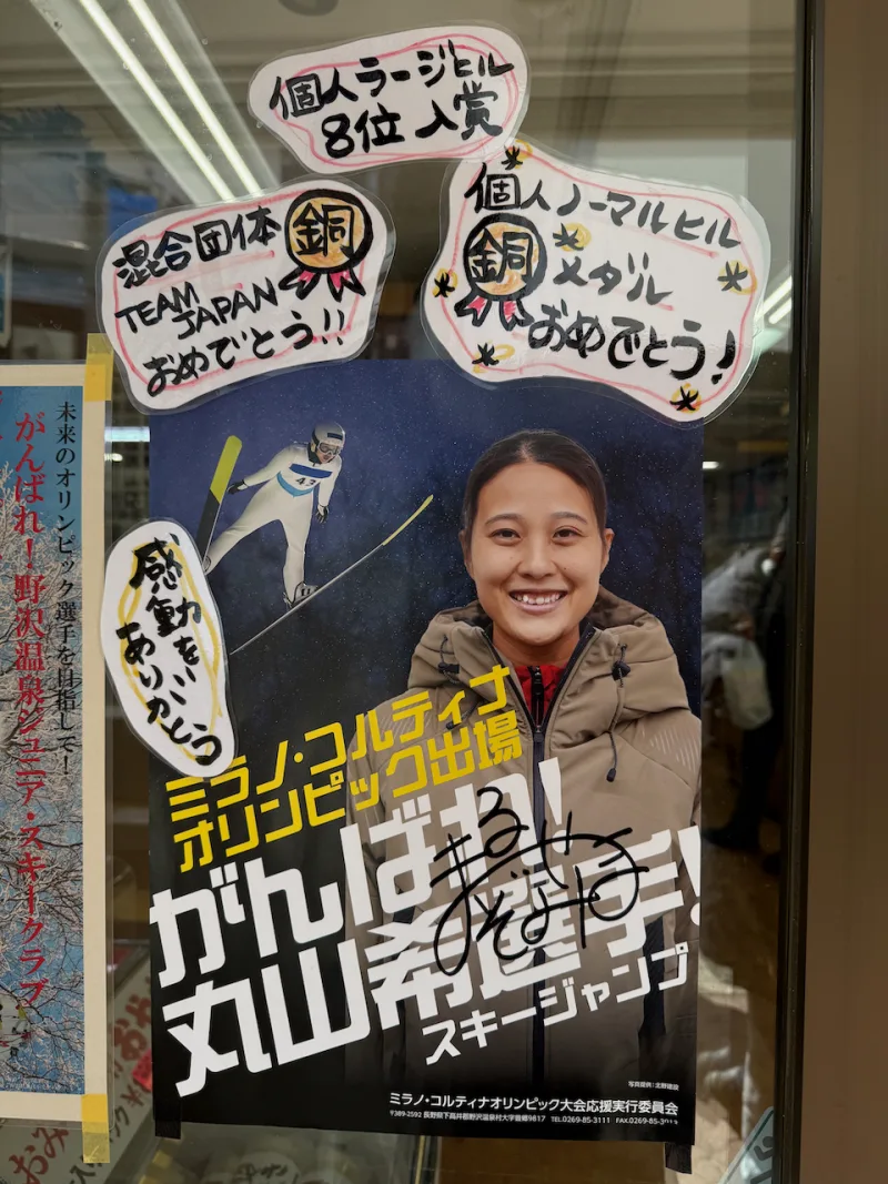 お店の入り口には, 野沢温泉村出身で, ミラノ・コルティナオリンピックでスキージャンプ個人ノーマルヒル銅メダルを獲得された丸山 希選手のサイン入り応援ポスターが貼ってありました.