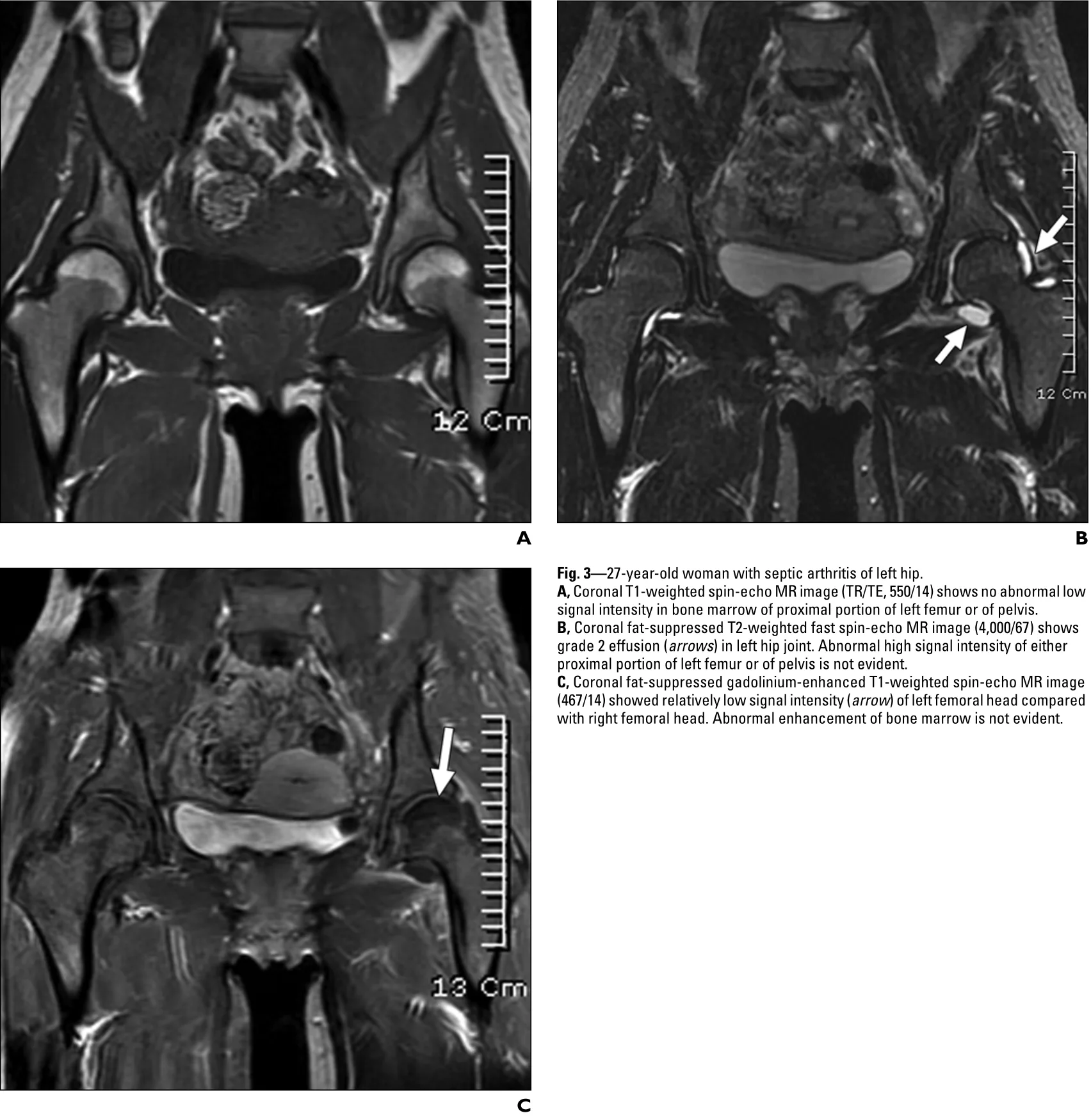 脂肪抑制T2強調画像 (B)では, 炎症によって股関節の中に貯まった関節液が白く描出されています.