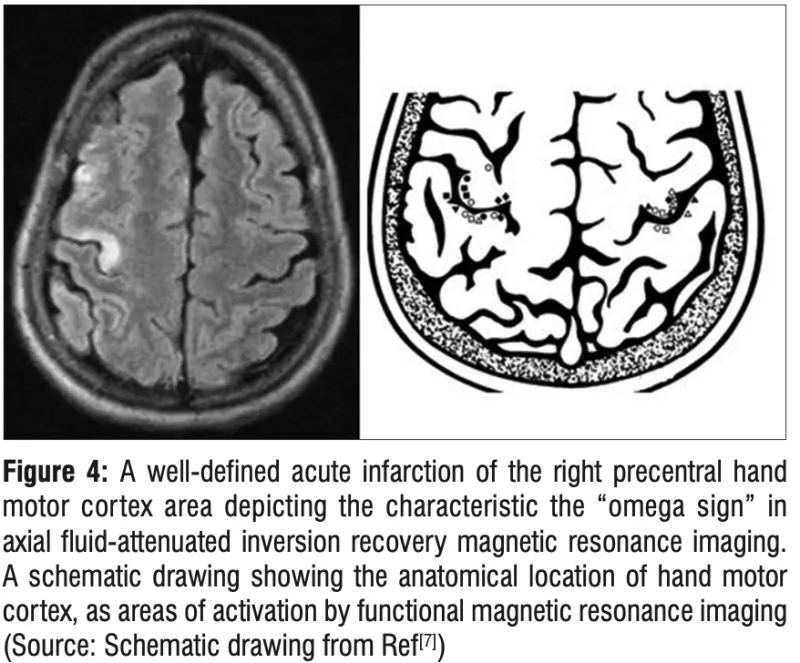 手の運動を司る大脳皮質部に白く写る信号変化が認められ, 梗塞を生じています.