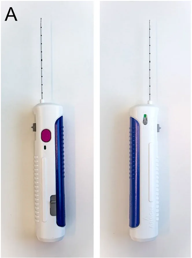 当科では, 軟部組織の針生検には, ARGON Medical Devices社のBioPince® Ultra Full Core Biopsy Instrumentの16G(ゲージ:針の太さ), 15 cm使用しています.