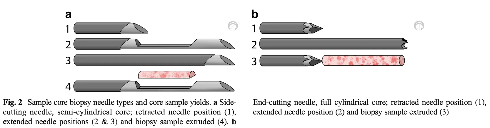 生検針には, 大きく分けて, サイドカット生検針(上図a)とフルカット生検針(上図b)があります.