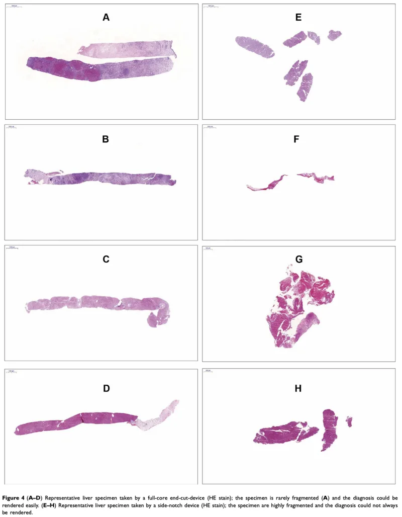 肝臓に対する針生検において, サイドカット針とフルカット針を比較検討した研究では, フルカット針の方が, サイドカット針よりも, より多くのきれいな組織を採取でき, 診断精度の向上に役立つことが明らかにされています.