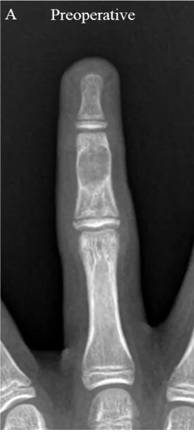 1件目の手術は, 中指の中節骨に生じた内軟骨腫という軟骨性良性腫瘍の切除術でした.