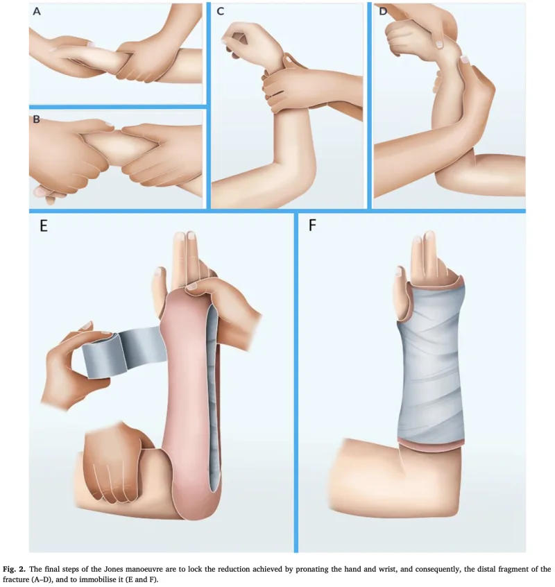 助手に腕を引っ張ってもらい (B), 手を引っ張って, ズレている骨片を牽引した後(C), 手の甲側から骨片を圧して, 元の位置に整復します(D).