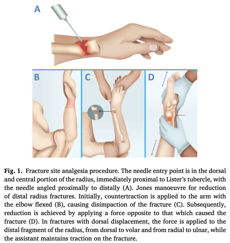 手の甲側から骨折部に直接針を刺して, 局所麻酔薬を注入します(A).